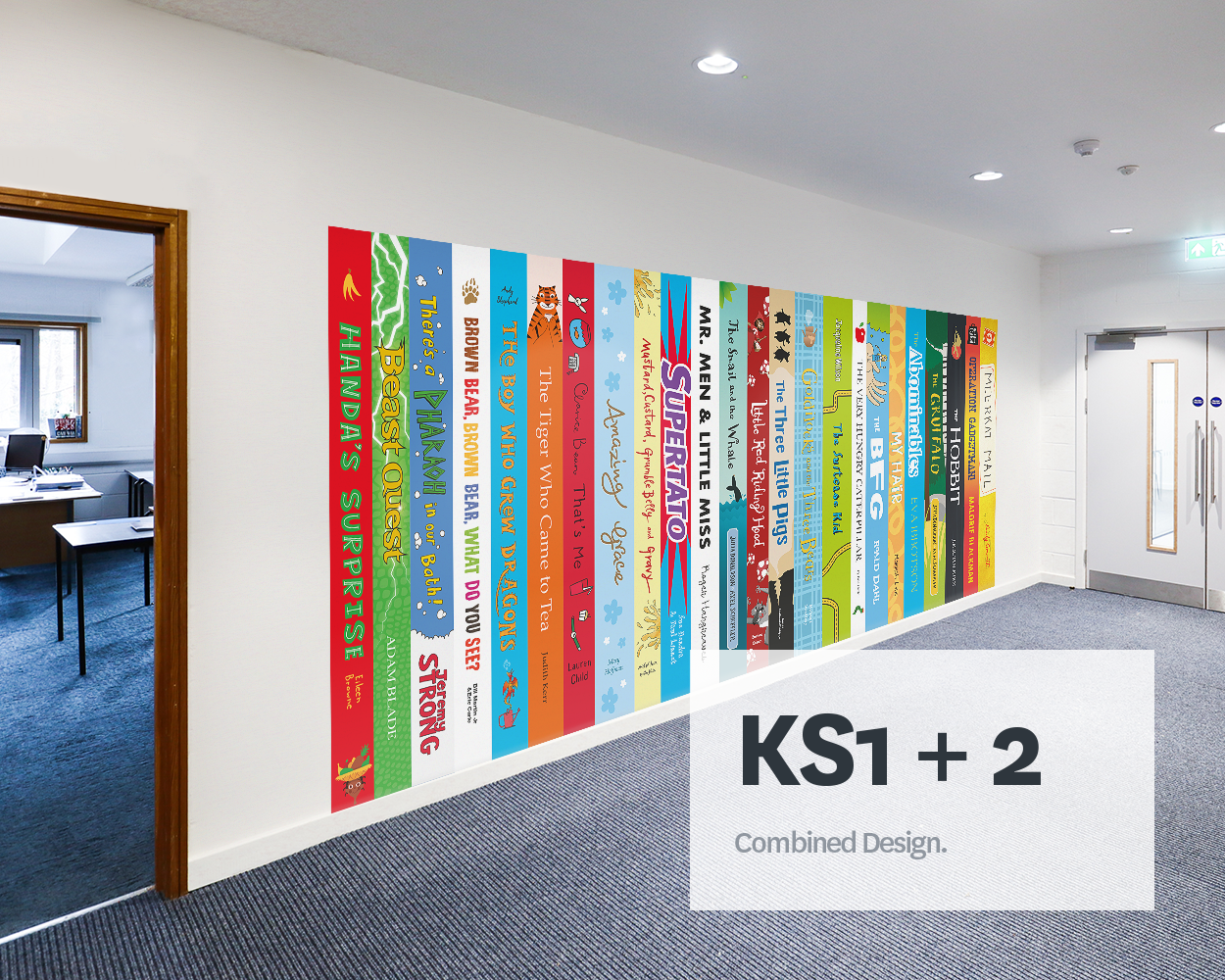 - Your chosen set of KS1 & KS2 Book Spines Wall Graphic printed across 2 drops of wallpaper. Each drop measures 60cm (width) x 200cm (height)