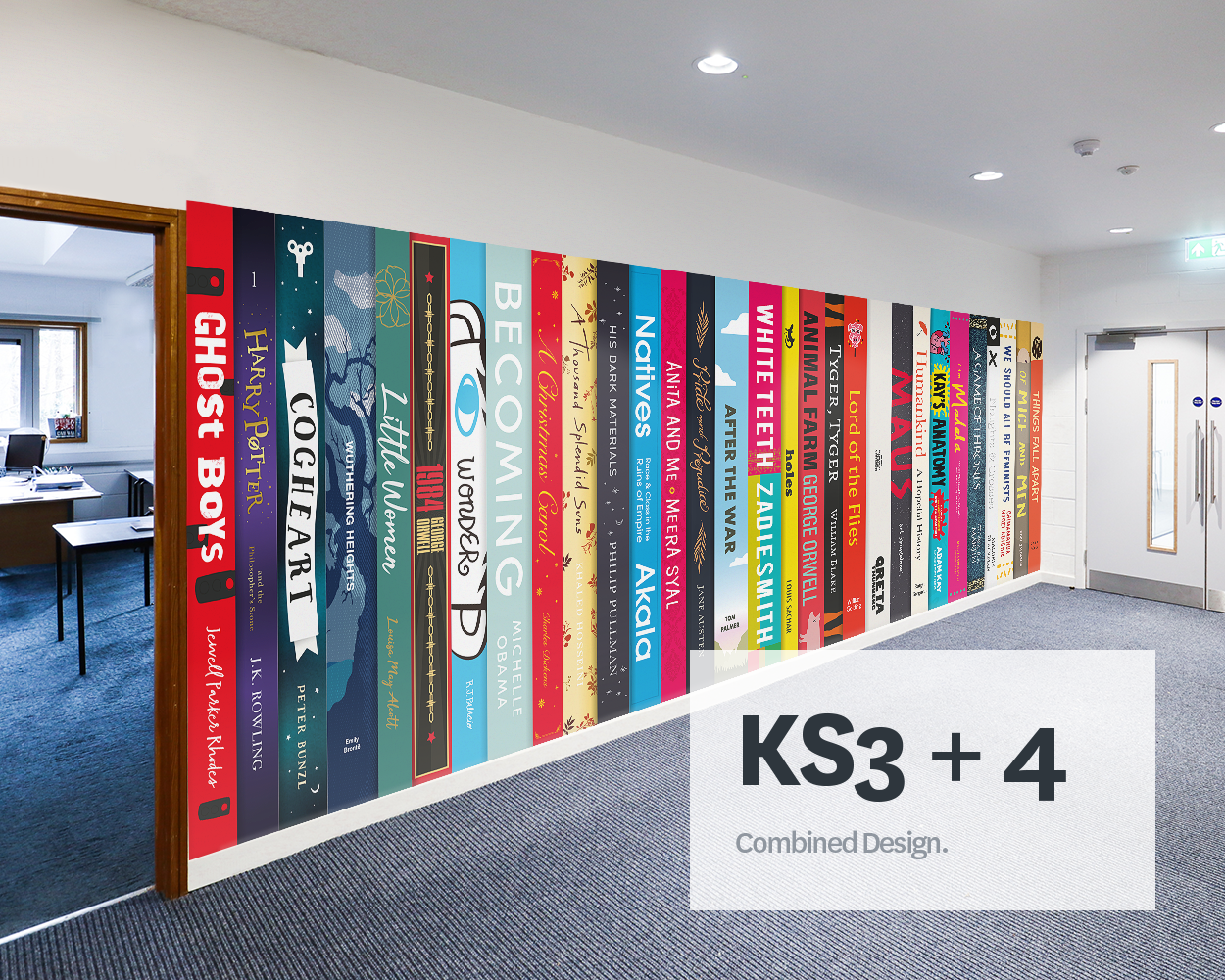 - Your chosen set of KS3 & KS4 Book Spines Wall Graphic printed across 2 drops of wallpaper. Each drop measures 60cm (width) x 200cm (height)