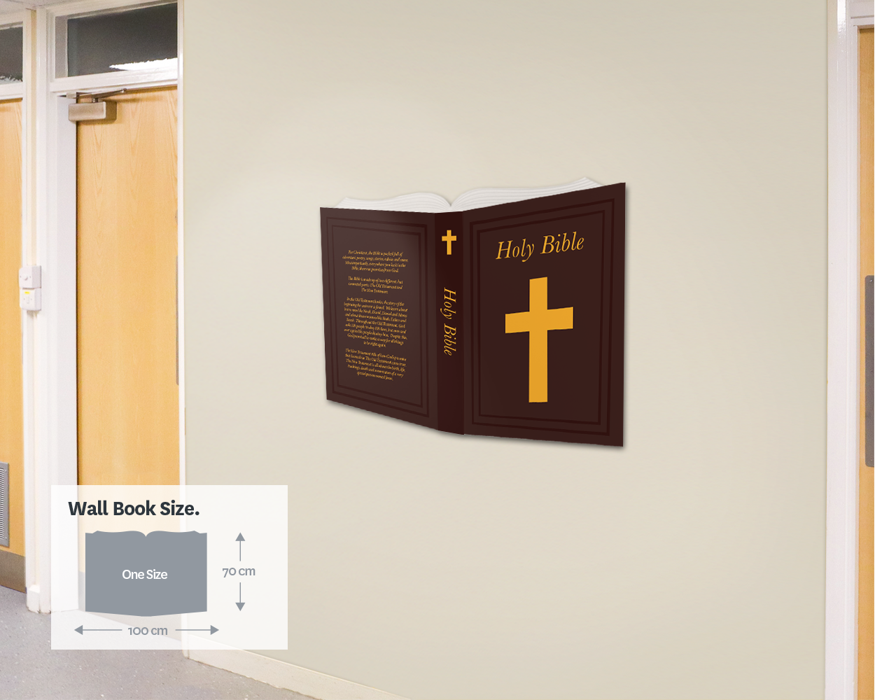This product is made to order on 10mm PVC foam board, in full colour print with wrapped edges. This product will be delivered as one main piece (100cm wide x 70cm high), ready to hang straight onto your wall, with an additional book spine section to finish off your book and hide your fixings. This is a heavy-duty product that can be installed in high-traffic internal areas, such as corridors, halls and classrooms.